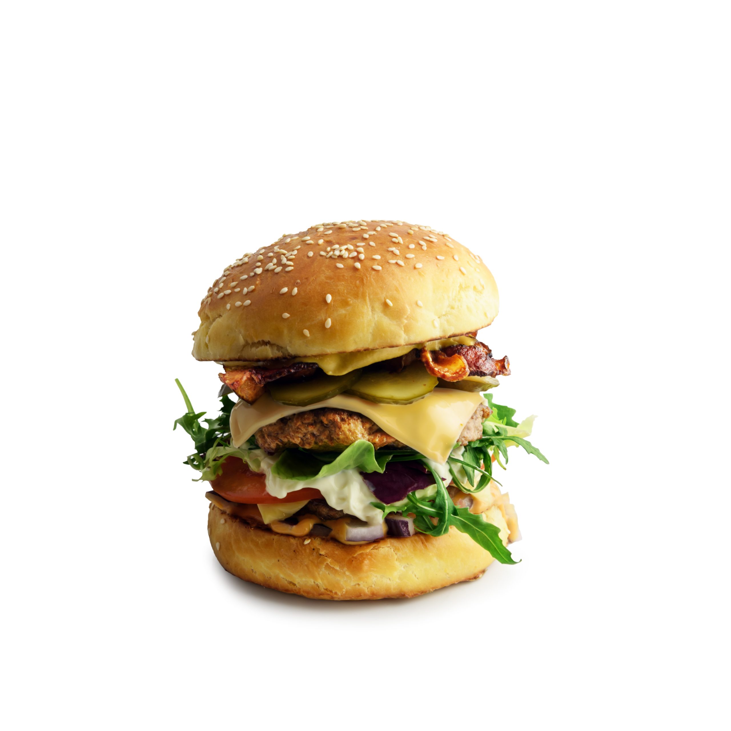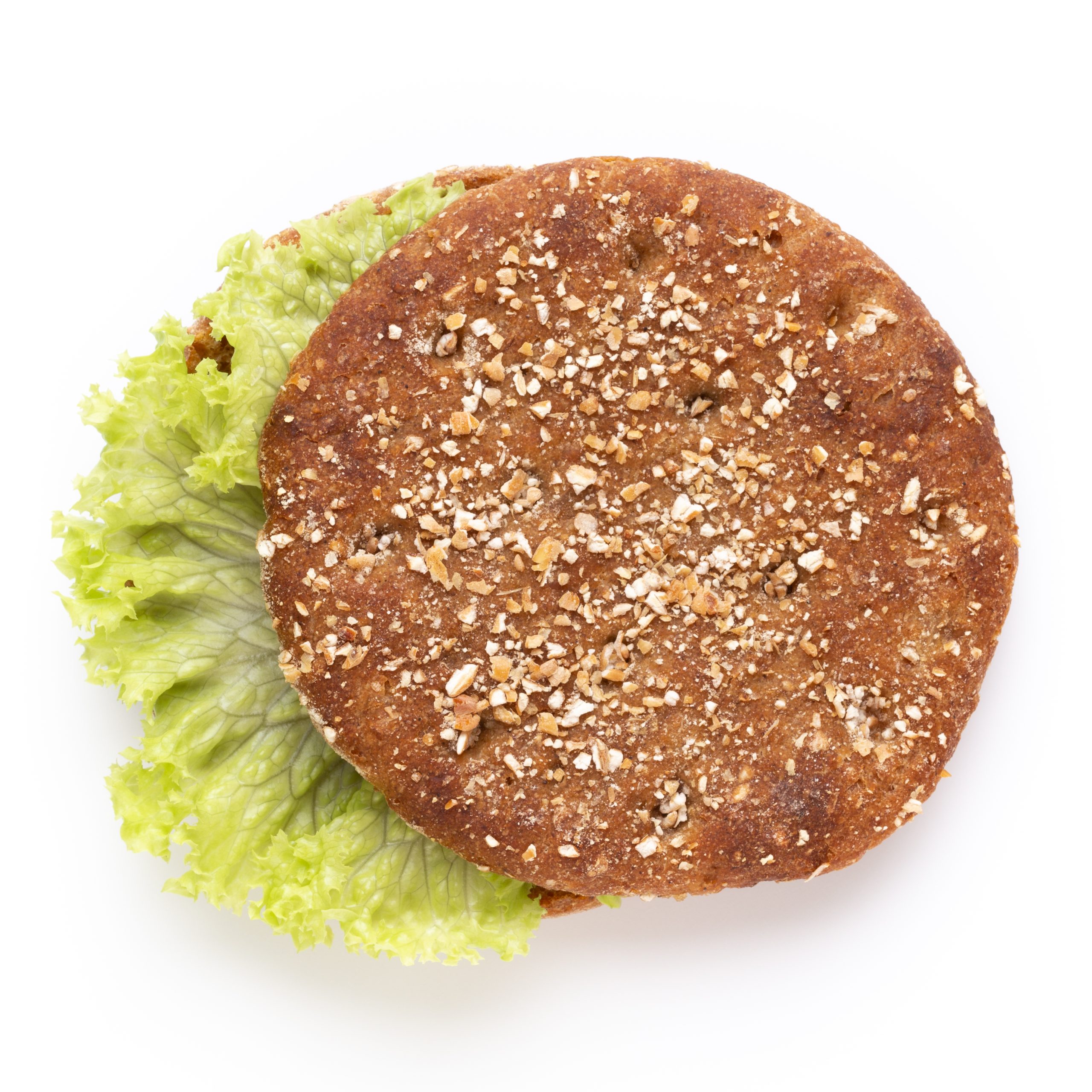 Base de proteína de guisante, mezcla de setas portobello, queso vegano fundido, lechuga fresca, tomate y mayonesa de aguacate en pan integral ecológico.
